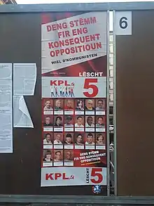 The KPL is represented locally on the councils of Differdange and Rumelange. In Rumelange it is part of the ruling coalition together with the LSAP.[2] It is the only leftwing majority coalition in Luxembourg.