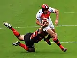 Rugby union rules do not allow tackles above the plane of the shoulders. Only the player who has possession of the ball can be tackled. The attacker must also attempt to wrap his or her arms around the player being tackled: merely pushing the player being tackled to ground with a shoulder is illegal. If a maul or ruck is formed, a player may not "ram" into the formation without first binding to the players.