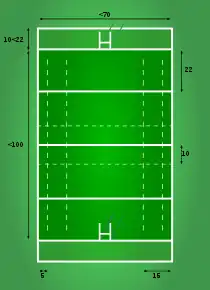 Both codes use rectangular grassed fields however the Gaelic football pitch has a larger area. A Gaelic football pitch is 130–145 metres long and 80–90 metres wide[1] and are marked at distances of 13 m, 20 m and 45 m from each end-line whereas the Rugby field is as near as possible to a maximum of 144m long by 70m wide.[2] with a maximum of 100m between the two try lines.