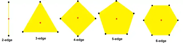 Analogously, a complex 1-polytope exists as a set of p vertex points in the complex line . These may be represented as a set of points in an Argand diagram (x,y)=x+iy. A regular complex 1-dimensional polytope p{} has p (p ≥ 2) vertex points arranged to form a convex regular polygon {p} in the Argand plane.[4]