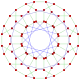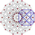 ![]() This complex polygon has 8 edges (complex lines), labeled as a..h, and 16 vertices. Four vertices lie in each edge and two edges intersect at each vertex. In the left image, the outlined squares are not elements of the polytope but are included merely to help identify vertices lying in the same complex line. The octagonal perimeter of the left image is not an element of the polytope, but it is a petrie polygon.[3] In the middle image, each edge is represented as a real line and the four vertices in each line can be more clearly seen. |