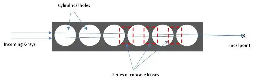 CRLs were first demonstrated in the mid-1990s by a group of scientists at the ESRF. They drilled holes in an aluminium block, and achieved focusing in two dimensions. For X-rays a concave lens focuses the X-rays because the index of refraction is slightly below unity. In a CRL of this type the walls between the cylindrical holes act as concave lenses for X-rays traveling perpendicular to the axis of the drilled cylinders. In contrast, for visible light the index of refraction is larger than unity and focusing is done with a convex lens.