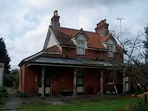 The station house, booking hall and some outbuildings (lamp and oil stores and a porter's shed) and the nearby substantial brick road overbridge are still in existence. A public footpath allows access to the platform side revealing the complete platforms but with the trackbed filled in to the same level and laid as a lawn. An enamel "Platform tickets to be given up on leaving platform" sign, although it is not known if this is original. The large, well-built and relatively intact goods shed was demolished in 2001 to make way for a small business area.[2]