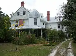 Originally a winter cottage, it consists of three floors and three stairways. The main staircase turns in front of a stained glass window. Red bricks make up the foundation of the house as well as the six interior fireplaces. The original color of the house was yellow with dark green trim. Before the grounds were subdivided, they consisted of sixty acres. Camphor trees lined the long drive that led to the house, which is now Bonita Drive.[2]