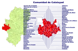 The Comunidad de Calatayud is one of the comarcas of Aragon, Spain. It is one of twelve comarcas (counties) within the province of Zaragoza in Aragón. The administrative headquarters are in the city of Calatayud. Local wine (Calatayud (DO)) achieved Denominación de Origen status in 1990 and it is the second largest wine-producing area in Aragón after Cariñena (DO).[1] Fruit and wheat are major agricultural products, there is also light industry and tourism.[2] The area is noted for balnearios (thermal spas) at Alhama de Aragón, Jaraba and Paracuellos, also for its mudéjar architecture.[3]