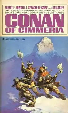 Conan of Cimmeria is a collection of eight fantasy short stories written by Robert E. Howard, L. Sprague de Camp, and Lin Carter and featuring Howard's sword and sorcery hero Conan the Barbarian. Most of the stories were originally published in various fantasy magazines. Lancer Books first published the paperback collection in 1969, and reprinted the book in 1970, 1972, and 1973.[1][2] After Lancer's bankruptcy, Ace Books took over publication.[1] Ace published its first edition in May 1977 and reprinted it in August 1977, 1979, 1980, 1982 (twice), 1984, 1985, 1990, and 1993. Sphere Books published the first British edition in 1974 and reprinted that edition in 1976 and 1987.[1][2] The book has also been translated into German, Japanese, Spanish, Dutch, Swedish and Italian.[1] It was gathered together with Conan and Conan the Freebooter into the omnibus collection The Conan Chronicles (Sphere Books, August 1989).[2]