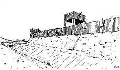 Excavations were carried out in 1978 and in 1990/1991. Unfortunately much of the fort is located beneath the town of Chester-le-Street so little remains to be seen, except for a portion of the excavated officer's quarters left on display. Finds included pottery, fine table wares, coins, animal bones, a cheese press and curiously even a tile with a dog's footprint on it.[5] Altars found range from ones dedicated to the war god Mars and the sun god Apollo, to ones to Celtic and German gods such as Digenis and Vitiris. The large (3 out of 8) number of altars dedicated to patron deities concerned with the wellbeing of veteran soldiers would seem to suggest the inhabitants of Concangis had a high proportion of ex-military men. Two large stones in a buttress of the parish church of St Mary and St Cuthbert have lewis holes for lifting, which strongly suggest they were recycled from the Roman fort.[6]