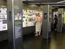 Above all, the private initiatives and extensive research by Volker Mall and Harald Roth[4] were the impetus for the establishment of a multimedia exhibition space on the ground floor of the Tailfinger Town Hall. The target groups are primarily school classes with pupils aged 14 and over. In addition to modern touch-screen monitors, a room-long chronological table over two metres high has been created, from which the connections can be understood. An aerial panorama of the airfield and its surroundings was taken from several aerial photographs taken in 1944/1945. The "Number Book" lists the names of all Jewish prisoners. However, the focus is on the individual fates of the camp inmates and the testimonies of contemporary witnesses from the Gäu region. The entire stock of digital documents can be used for research purposes. The entire exhibition site has been deliberately designed for possible extensions. At the end of 2008 a documentary film was made: "Das KZ-Außenlager Hailfingen/Tailfingen" by Bernhard Koch in cooperation with Gegen Vergessen - Für Demokratie.