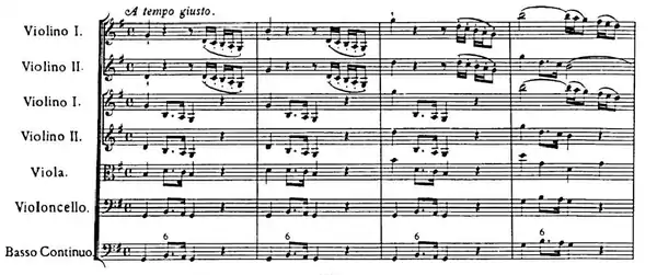 The first movement, in the style of a French overture with dotted rhythms and scale passages, for dramatic effect has the novel feature of being prefaced by a two bar passage for the first concertino violin.