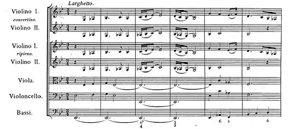 8 time brings the concerto back to E minor and a more serious mood, with chromaticism and unexpected key changes in the dialogue between concertino and ripieno.