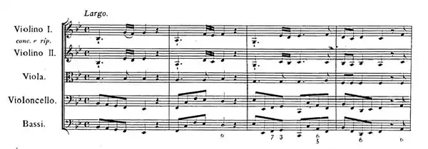 The largo e piano in F major is one of Handel's most sublime and simple slow movements, a sarabande in the Italian trio sonata style. Above a steady crotchet walking bass, the sustained theme is gently exchanged between the two violin parts, with imitations and suspensions; harmonic colour is added in the discreet viola part. In the closing bars the crotchet figure of the bass passes into the upper strings before the final cadence.