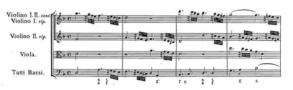 2 time follows the pattern set by Corelli. The concertino parts dominate the movement, with the two solo violins in expressive counterpoint. Each episode for soloists is followed by a tutti response.