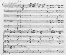 For the 1739–1740 season at the Lincoln's Inn Fields theatre,[4] Handel composed Twelve Grand Concertos to be performed during intervals in these masques and oratorios, as a feature to attract audiences: forthcoming performances of the new concertos were advertised in the London daily papers. Following the success of his organ concertos Op.4, his publisher John Walsh had encouraged Handel to compose a new set of concertos for purchase by subscription under a specially acquired Royal License. There were just over 100 subscribers, including members of the royal family, friends, patrons, composers, organists and managers of theatres and pleasure-gardens, some of whom bought multiple sets for larger orchestral forces. Handel's own performances usually employed two continuo instruments, either two harpsichords or a harpsichord and a chamber organ; some of the autograph manuscripts have additional parts appended for oboes, the extra forces available for performances during oratorios. Walsh had himself very successfully sold his own 1715 edition of Corelli's celebrated Twelve concerti grossi, Op. 6, first published posthumously in Amsterdam in 1714.[5] The later choice of the same opus number for the second edition of 1741, the number of concertos and the musical form cannot have been entirely accidental; more significantly Handel in his early years in Rome had encountered and fallen under the influence of Corelli and the Italian school. The twelve concertos were produced in a space of five weeks in late September and October 1739, with the dates of completion recorded on all but No.9. The ten concertos of the set that were largely newly composed were first heard during performance of oratorios later in the season. The two remaining concertos were reworkings of organ concertos, HWV 295 in F major (nicknamed "the Cuckoo and the Nightingale" because of the imitations of birdsong in the organ part) and HWV 296 in A major, both of which had already been heard by London audiences earlier in 1739. In 1740 Walsh published his own arrangements for solo organ of these two concertos, along with arrangements of four of the Op. 6 concerti grossi (Nos. 1, 4, 5 and 10).[6]