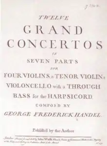 The Concerti Grossi, Op. 6, or Twelve Grand Concertos, HWV 319–330, are 12 concerti grossi by George Frideric Handel for a concertino trio of two violins and violoncello and a ripieno four-part string orchestra with harpsichord continuo. First published by subscription in London by John Walsh in 1739, in the second edition of 1741 they became Handel's Opus 6. Taking the older concerto da chiesa and concerto da camera of Arcangelo Corelli as models, rather than the later three-movement Venetian concerto of Antonio Vivaldi favoured by Johann Sebastian Bach, they were written to be played during performances of Handel's oratorios and odes. Despite the conventional model, Handel incorporated in the movements the full range of his compositional styles, including trio sonatas, operatic arias, French overtures, Italian sinfonias, airs, fugues, themes and variations and a variety of dances. The concertos were largely composed of new material: they are amongst the finest examples in the genre of baroque concerto grosso.
