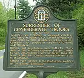 The first major stage in the peace-making process was when Lee's surrender occurred at Appomattox on April 9, 1865.[21] This, coupled with Lincoln's assassination, induced Johnston to act, believing: "With such odds against us, without the means of procuring ammunition or repairing arms, without money or credit to provide food, it was impossible to continue the war except as robbers."[22] On April 17 Sherman and Johnston met at Bennett Place, and the following day an armistice was arranged, when terms were discussed and agreed upon. Grant had authorized only the surrender of Johnston's forces, but Sherman exceeded his orders by providing very generous terms. These included: that the warring states be immediately recognized after their leaders signed loyalty oaths; that property and personal rights be returned to the Confederates; the reestablishment of the federal court system; and that a general amnesty would be given. On April 24, the authorities in Washington rejected Sherman's proposed terms; two days later, Johnston agreed to the same terms Lee had received previously on April 9.[23]