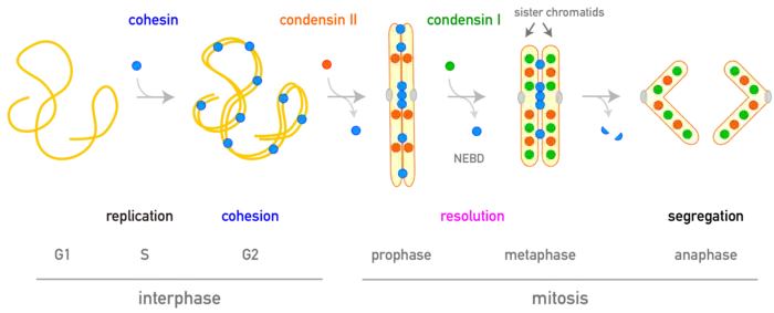 In human tissue culture cells, the two condensin complexes are regulated differently during the mitotic cell cycle (Figure 4).[56][57] Condensin II is present within the cell nucleus during interphase and participates in an early stage of chromosome condensation within the prophase nucleus. On the other hand, condensin I is present in the cytoplasm during interphase, and gains access to chromosomes only after the nuclear envelope breaks down (NEBD) at the end of prophase. During prometaphase and metaphase, condensin I and condensin II cooperate to assemble rod-shaped chromosomes, in which two sister chromatids are fully resolved. Such differential dynamics of the two complexes is observed in Xenopus egg extracts,[58] mouse oocytes,[59] and neural stem cells,[60] indicating that it is part of a fundamental regulatory mechanism conserved among different organisms and cell types. It is most likely that this mechanism ensures the ordered action of the two complexes, namely, condensin II first and condensin I later.[61]