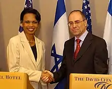 In late December 2008, after Israel broke the Gaza Strip ceasefire with an incursion into the Gaza Strip, Rice kept outgoing President George W. Bush abreast of the situation.[25] "The United States strongly condemns the repeated rocket and mortar attacks against Israel and holds Hamas responsible for breaking the cease-fire and for the renewal of violence in Gaza," Rice said in a statement. "The cease-fire should be restored immediately. The United States calls on all concerned to address the urgent humanitarian needs of the innocent people of Gaza."[26] In early January 2009, Rice went to New York and personally negotiated United Nations Security Council Resolution 1860 supporting a ceasefire, but then abstained on its 14-0 passage. Explaining the abstention, Rice said the US wanted to first see the outcome of the Egyptian peace efforts, but allowed the resolution to go forward because it was a step in the right direction.[27] Israeli Prime Minister Ehud Olmert later claimed he humiliated Rice by persuading U.S. President Bush to instruct her not to vote for it. Rice spokesman Sean McCormack has called Olmert's claims "100-percent, totally, completely not true," but on January 14, Olmert aides said the Israeli leader told the story as it happened. Olmert has also claimed that Bush broke off a speech he was giving in Philadelphia to take his call, and that the abstention embarrassed Rice.[28]