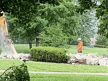 After 2017 public discussion around the monument, the Indy Parks and Recreation board passed a non-binding recommendation that the monument be removed, but the city never followed through on funding the proposed project or directing the monument's removal. The protective fencing was later removed. On June 4, 2020, after days of Black Lives Matter protests in Indianapolis and throughout the country after the murder of George Floyd, Mayor Joe Hogsett announced that the city was currently identifying the source of an estimated $50,000–$100,000 which would be required to dismantle the monument, which he said could happen within a week.[24] In his statement, Hogsett said that the city believed the monument belonged in a museum instead of its location in the public park, but that no organization stepped up to assume responsibility, and so "time is up."[25] The monument was dismantled and removed by city crews on the morning of June 8, 2020.[26] This monument was commissioned in 1912 by Greenlawn Cemetery and memorializes Confederate soldiers who died at Camp Morton, a Union prison camp. Efforts by public officials active in the Ku Klux Klan in 1928 lead to the monument's relocation to Garfield Park to make it more visible. A resolution to remove the monument passed the Indianapolis Parks Board in 2017, but was not funded. Mayor Joe Hogsett announced the monument would be removed from the park.[27][28][29]