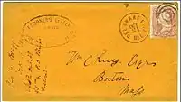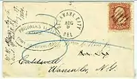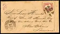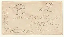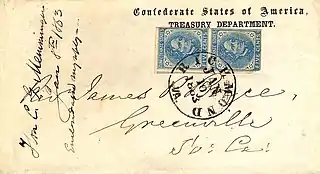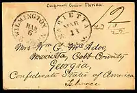 During the first seven weeks of the Civil War, the US Post Office still delivered mail from the seceded states. Mail that was postmarked after the date of a state's admission into the Confederacy through May 31, 1861, and bearing U.S. (Union) postage is deemed to represent 'Confederate State Usage of U.S. Stamps'. i.e., Confederate covers franked with Union stamps.[4] After this time, private express companies still managed to carry the mail across enemy lines. The three major express companies in operation throughout the south were Adams Express, American Letter Express, and Whiteside's Express. They had been operating freely for approximately two months when the U.S. Post Office ordered an end to such traffic, effective August 26, 1861. Mail destined to states that were not among their own unions now had to be sent by Flag of Truce, although some express companies still continued to run their mail operations illegally; Adams continued its Southern operations under a nominally-separate Southern Express Company, in actuality a subsidiary. Mail was also smuggled in and out by blockade-running ships—which, however, were often captured or destroyed by Union ships on blockade patrol. Because Confederate post offices existed for only a few years and official and informal records of them are lacking, relatively little is known about their operations in many regions of the South. Existing data has been studied by several experts in the field, who have reconstructed an account of their existence and operation largely from surviving Confederate covers (stamped-addressed envelopes), and by researchers specializing in advanced studies of Confederate philately, notably Colonel Harvey E. Sheppard, United States Army, Fort Hood, Texas; the late Van Dyk MacBride, Newark, New Jersey; George N. Malpass, St. Petersburg, Florida; Earl Antrim, Nampa, Idaho; David Kohn, Washington, D. C., and a few others, each contributing material in the concerted effort to create an overall account of Confederate postal history.[3][5]