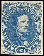 - The first postage stamp issued by the Confederate States (1861) was a 5¢ green depicting Jefferson Davis. It was printed by the lithograph process by Hoyer and Ludwig of Richmond, Virginia. Like almost all Confederate issues, these stamps were imperforate, and single stamps had to be cut from the sheet with razors or scissors. This stamp was reprinted in blue in 1862.