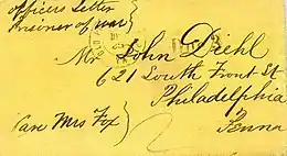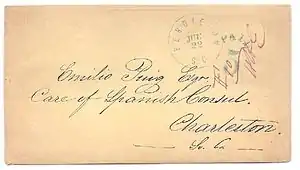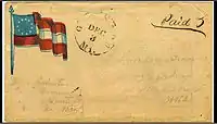 A considerable number of Confederate covers (i.e. stamped - addressed envelope) survived the Civil War and through the many years since they were mailed and have been avidly sought after and preserved by historians and collectors alike. The war had divided family members and friends across the country, and letter writing naturally increased dramatically, especially to and from the men who were away serving in an army. Letters written by soldiers reveal how they would frequently ask parents, wives and family members to write often and to also ask others to write letters back to them. As mail sent to and from the soldiers became more commonplace in the mail streams of the divided states, various Christian charity groups provided pens, paper and envelopes for the soldiers in response to their constant need for these items, since soldiers on active duty during wartime rarely had the opportunity to buy these things. The variety of mail from this time period provides the student of Civil War history with an excellent cross-reference of the history involved then.[15] Special categories of interest include covers to and from soldiers, patriotic covers, prisoner-of-war covers, Flag of Truce and through-the-lines mail, mail carried by blockade runners to and from Europe, and a variety of other types. All of these specialties have been intensively studied. Although contemporary official records are often fragmentary or missing, and many details remain unclear, the covers with their addresses, dated postmarks, special markings and the letters themselves have provided much insight for historians and collectors in their studies of Civil War postal history. Some forging of material went on in the late 19th century, and authentication is a challenge for experts. As a rule of thumb a collector should be wary of fancy cancels on Confederate mail, as the CSA Post Office never used fancy cancels. Other common types of forgeries include added stamps to a cover and forged postmarks. Another common oversight of the forger is postmarking stamps with dates before the stamp was issued.[16] Many collectors over the years have marked or destroyed fakes and forgeries upon identification in an effort to keep the collecting pool safe from such material. This is a practice common to most of philately.[17]