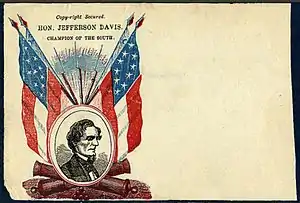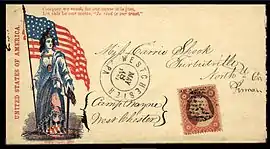 The years during the American Civil War were a period marked with strong sentiments and loyalties towards both sides involved, and this sentiment is clearly displayed on various Civil War correspondence known to collectors and historians as Patriotic Covers. Citizens, many of whom had family members and friends off fighting in the war, or who had died in battle, often expressed their loyalties with envelopes illustrated with flags, portraits, slogans and allegorical figures such as that of Liberty, which clearly captured the sentiments of that time. This practice was most evident in the North where there were many printers, especially in the larger cities, who produced an assortment of envelopes that proudly displayed these designs and which quickly became popular among the citizenry. The situation in the south was quite different. The demand for printers in the agrarian South was much less, and consequently established and qualified printers were generally nonexistent throughout most of the Confederacy. The South also lacked the North's industrialized advantages and supplies, and so the various Confederate patriotic covers that have survived the years are scarce and rare and usually have considerable value.[27][28]