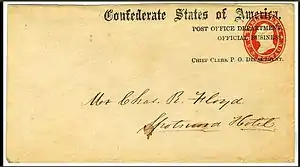 The CSA Constitution had provided for a national postal service to be established, then required it to be self-financing beginning March 1, 1863 (Section 8. Powers of Congress, Item 7). President Jefferson Davis had appointed John Henninger Reagan on March 6, 1861, to head the new Confederate States of America Post-office Department. The Confederate Post Office proved to be very efficient and remained in operation for the entire duration of the Civil War.[1][2][3]