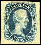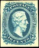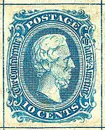 - A 10¢ blue with Thomas Jefferson also appeared in 1861, designed by Charles Ludwig of Hoyer & Ludwig, Richmond, Virginia. This issue was printed by two different companies: Hoyer & Ludwig and, later, J. T. Paterson & Co. of Augusta, Georgia. The image of Thomas Jefferson used on both printings lithographically reproduced the same image that had been engraved on the U.S. 5-cent issue of 1856. Secret marks were added by the Paterson firm to the transfer stones to distinguish its version from the Hoyer & Ludwig prints of the same design. The most typical use was for the ten-cent rate after July 1, 1862. This stamp, like the 5¢ Davis, was reprinted in 1862, in a rose-colored version that is considerably rarer than the blue original.[10]
