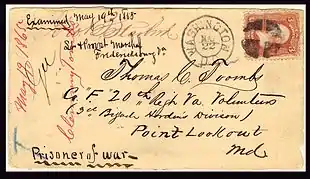 When the Civil War got underway, both sides were ill-prepared to deal with the very large numbers of captured troops. For a time a prisoner and mail exchange program was in use that lasted until June 1863, when the U.S. Government terminated any further cooperation due to mounting war tensions and increased mistrust.[20] The postmarks and stampings found on wartime mail from military prisons and camps during the war are sought after by historians and collectors, not only for their souvenir value but also as confirmation that various people, events and places existed at the time of mailing indicated by the name, address, postmark and other official markings. The mailed covers often bear the postmark of the nearest town or city from where the prison or camp was located. The study of Civil War military postal history and postmarks is an area of philately that involves a great volume of material covering town names, history, rarity, postmarks and other official markings found on mail to and from POW facilities. In the Nav-boxes below are two partial lists of some of the larger prison facilities, Union and Confederate, in operation during some or all of the war. Numbers for inmate totals are included to provide insight into knowing the amount of any surviving mail that is or may be in existence. There were also prison facilities that contained much smaller numbers of prisoners (a couple listed here) also. Records for some prison facilities are completely lacking, the total numbers of prisoners held, peak prison population amounts, escapes and deaths remaining unknown at the present time. Surviving prisoner of war mail to or from some of these places is exceedingly rare, and in some cases no covers are known to exist.[21]