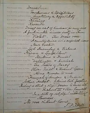 Whatever their origins, confession albums were an established form by the 1860s: Henry d'Ideville records using an album in 1861 (see Germany and France below); Karl Marx filled out answers to one in the spring of 1865 (his favourite colour was red); and Friedrich Engels answered another in 1868 (his idea of happiness was Château Margaux 1848).[6] Early albums often had blank pages into which owners would paste the questionnaires; the questions on these could be preprinted or handwritten.[7] One such album with handwritten questions, was that of Karl Marx's daughter Jenny, which contains entries dated from 1865 to 1870. For some of these, she sent the questions to friends, asking them to fill them out and return them. Her comments in a letter of November 1865 suggest that she regarded the genre as a novelty:[8]