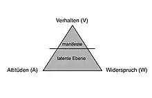 The theory was created by Johan Galtung and was published in Journal of Peace Research in 1969.[2] The triangle highlights three aspects of a conflict situation: on top of the triangle is B or Behavior (people's actions, statements, insults and so on), on the sides A for Attitude (it includes feelings, prejudices and beliefs) and C for Contradiction[3] or Context.[4] The last one can be defined by inequality, territorial or economic arguments.[5] The triangle is divided into two parts like an iceberg, the upper one (with B on top) being visible, while the lower part of the triangle (with the sides A and C) hidden.