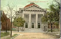On March 4, 1904 the congregation laid the cornerstone for its present building, known as the Franklin Street Synagogue. The building was dedicated on December 9, 1904.[1] The domed, Neoclassical synagogue was designed by the Richmond-based firm of Noland and Baskervill, who also designed nearby St. James' Church and the wings of the Virginia State Capitol. The synagogue has 29 stained glass windows. Most notable is a window on the building's eastern wall created and signed by the Louis Comfort Tiffany Studios in 1923. It depicts Mt. Sinai.