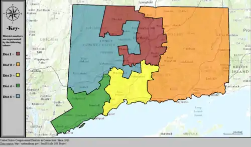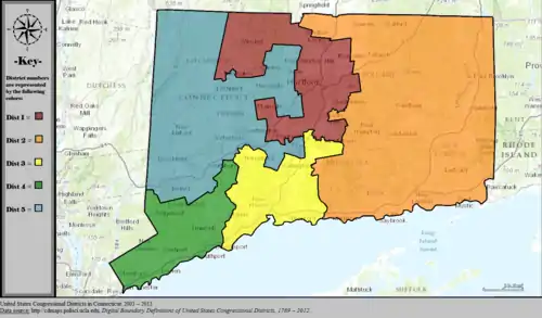 Table of United States congressional district boundary maps in the State of Connecticut, presented chronologically.[5] All redistricting events that took place in Connecticut between 1973 and 2013 are shown.