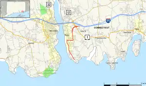 ![]() Map of New London County in southeastern Connecticut with Route 349 highlighted in red | ||||