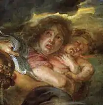 Venus: The Roman goddess of love (and Mars's mistress) endeavors to restrain Mars and maintain peace. Her arm is looped ineffectually around his in a physical gesture. Her expression, meanwhile, plaintively entreaties Mars to stop his charge. Venus is depicted in typical Rubensian fashion with characteristic rolls of exposed flesh (See Arrival of Marie de' Medici or The Judgment of Paris for comparison.[4]) The goddess is accompanied by Amors and Cupids who attempt to assist her.