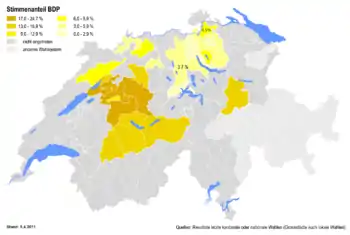 Upon the BDP's founding, seventeen members of the Grand Council of Bern defected from the SVP. In the 2010 election, the number of BDP councillors increased to 25, making the BDP the third-largest party in Bern, behind the SVP and the Social Democratic Party.