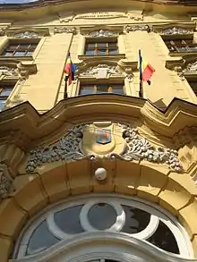 The building was erected between April 1902 and July 1903, on a 2,500-square-fathom plot of land, with four street fronts, the main facade being individualized by a huge access gate made of solid wood, beautifully decorated. It was designed by Ignác Alpár.[8] The building is distinguished by a balanced, solemn architecture, obtained by a strong massiveness, being composed of a main body with two wings and a building adjacent to the first body that houses the sports hall. The architectural style is that of the Viennese Baroque, distinguished by symmetry and balance. The windows and the pediment on the first floor have baroque frames, and the windows on the upper floor have semicircular arches with decorations.[6]