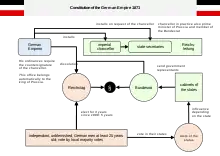 The Constitution of the German Empire (German: Verfassung des Deutschen Reiches) was the basic law of the German Empire of 1871-1918, from 16 April 1871, coming into effect on 4 May 1871.[1] German historians often refer to it as Bismarck's imperial constitution, in German the Bismarcksche Reichsverfassung (BRV).