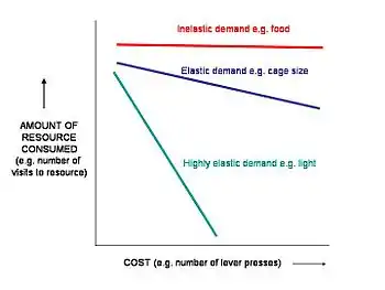The test results are analogous to human patterns of purchasing resources with a limited income.[2][3] For humans, the cost of resources is usually measured in money; in animal studies the cost is usually represented by energy required, time taken or a risk of injury.[4] Costs of resources can be imposed on animals by an operant task (e.g. lever-pressing), a natural aversion (e.g. crossing water), or a homeostatic challenge (e.g. increased body temperature). Humans usually decrease the amount of an item purchased (or consumed) as the cost of that item increases. Similarly, animals tend to consume less of an item as the cost of that item increases (e.g. more lever presses required).[5][6]
