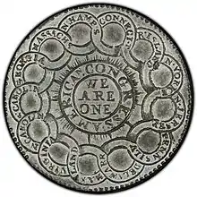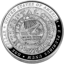 The Continental Currency dollar coin (also known as Continental dollar coin, Fugio dollar, or Franklin dollar) was the first pattern coin struck for the United States.[1][2] The coins were minted in 1776 and examples were made on pewter, brass, and silver planchets.[3]
