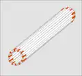 When detonated, the high explosive imparts momentum to the rods, thrusting them outward in an expanding circle. The pressure wave from the explosive needs to act evenly on the rods over their length, so some sort of tamper is used to shape the shock wave similar to an explosive lens. The rods are sufficiently soft (ductile) to allow the expansion without breaking the rods or the welded joints, and the detonation velocity is limited to under 1,150 m/s,[2] allowing the rods to bend at these locations instead. At some intermediate point the ring will have a zig-zag (alternating direction) appearance within a cylindrical envelope. Upon ultimate expansion the ring is circular and contained within a plane. The ring will then break and ultimately tend to form one or more straight rods. Since the net momentum of the rod relative to the missile is roughly zero its effectiveness will rapidly diminish as the broken ring expands.[3]