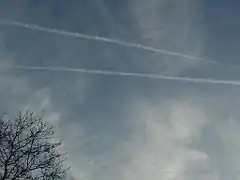 Depending on the temperature and humidity at the altitude the contrails form, they may be visible for only a few seconds or minutes, or may persist for hours and spread to be several miles wide, eventually resembling natural cirrus or altocumulus clouds.[1] Persistent contrails are of particular interest to scientists because they increase the cloudiness of the atmosphere.[1] The resulting cloud forms are formally described as homomutatus,[3] and may resemble cirrus, cirrocumulus, or cirrostratus, and are sometimes called cirrus aviaticus.[4] Some persistent spreading contrails contribute to climate change.[5]