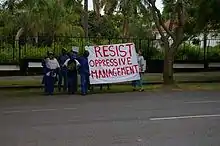 On Thursday, 2 February 2006, the four unions at UKZN (COMSA, NEHAWU, NTESU, and UNSU) served notice to University Management that they would commence strike on Monday, 6 February 2006.[1] The immediate grievance was the sub-inflationary wage increases of the general staff while senior management was given bonuses.[1] However, the unions also cited the "corporatization" of the university and the rise of an "authoritarian style of Management" as wider concerns.[1] The strike was timed with the first week of the academic year (registration week) in order to demonstrate seriousness.[1]