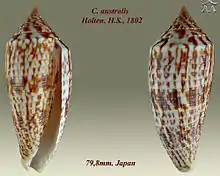 | Apertural and abapertural views of shell of Conus australis Holten, H.S., 1802 | |