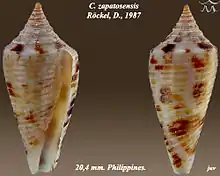 | Wikimedia Commons has media related to Conus zapatosensis. |