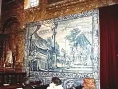 The 17th-century decoration is also represented in the azulejo tile, attributed to José Meço and Teotónio dos Santos, disciple of António Bernardes, who completed their projects between 1720 and 1730. The four panels represent the story of Joseph (son of Jacob), starting from the left of the altar with Joseph and his flock, Joseph and his brothers, the well where he was imprisoned and the revelation to his father (Jacob); while to the right of the altar, the Pharoh's dream and Joseph's interpretation, while the last panel shows Joseph's triumph in Egypt. On the floor slab, close to the grid is a tombstone, sculpted in marble relief.