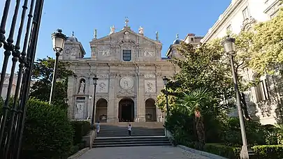 The Convent of the Salesas Reales is an 18th-century architectural complex in central Madrid, Spain. Formerly a convent, specifically the convent of the Visitación de Nuestra Señora (Visitation of Our Lady), it was constructed and occupied by the Order of the Visitation of Holy Mary, which had been founded by St. Francis de Sales and St Jeanne de Chantal. The convent's church (dedicated to St Barbara) is now a parish church, and the remainder of the complex houses the Supreme Court of Spain.