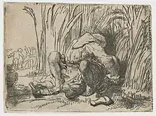 - "At last, Maria Clara emerged from the bath accompanied by her friends, fresh as a rose opening its petals with the first dew, covered with sparks of fire from the early morning sun. Her first smile was for Crisostomo (Ibarra), and the first cloud on her brow for Padre Salvi..." (Padre Salvi, although a priest, is an admirer of Maria Clara.) "Their legs were up to the knees, the wide folds of their bathing skirts outlining the gracious curves of their thighs. Their hair hung loose and their arms were bare. They wore striped gay-colored blouses... Pale and motionless, the religious Actaeon (i.e. Padre Salvi, who was hiding in the bushes, acting as a voyeur) watched this chaste Diana (i.e. Maria Clara): his sunken eyes glistening at the sight of her beautifully molded white arms, the graceful neck ending in a suggestion of a bosom. The diminutive rosy feet playing in the water aroused strange sensations and feelings in his impoverished, starved being and made him dream of new visions in his fevered mind."[4]