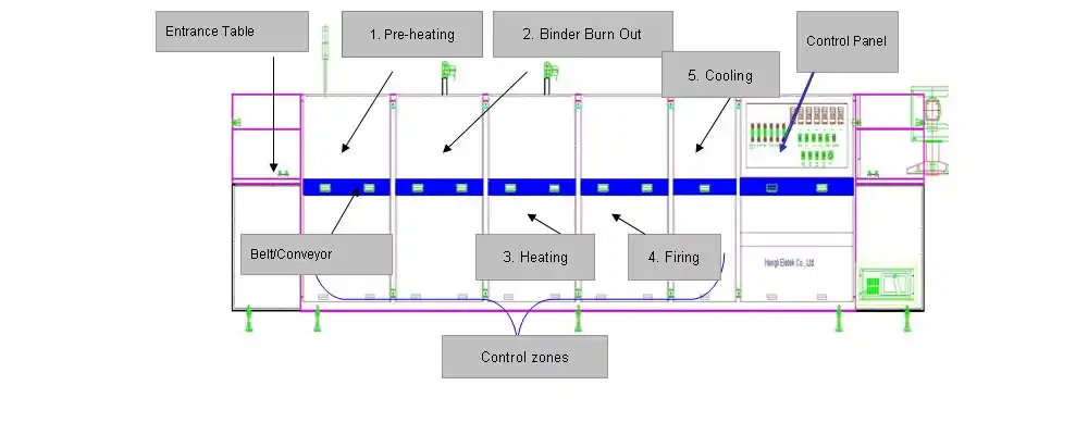 Normally a conveyor furnace adopts a tunnel structure and is composed of multiple controlled zones which include zones for preheating, binder burn out, heating, firing, and cooling. A conveyor furnace also features fast thermal responses, uniform and stable temperature distribution; it can heat treated parts to 1050 deg. C. (may vary for different model). Belt speed of a conveyor furnace can be up to 6000mm/min. Products are heated efficiently by infrared radiation (it can also be ceramic heaters or IR lamps) and are dried and fired after passing through the controlled zones, followed by rapid cooling.