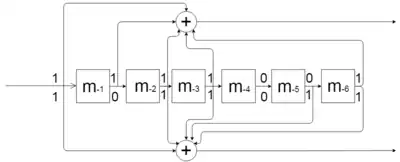 The convolutional code with a constraint length of 2 and a rate of 1/2 is used in GSM as an error correction technique.[13]